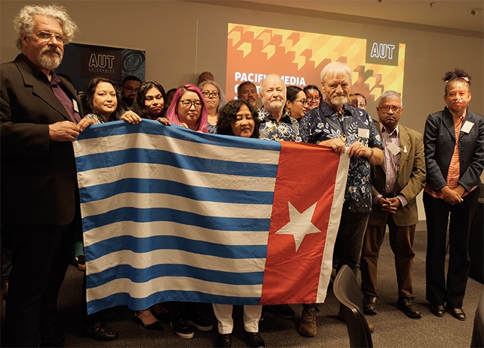 AUCKLAND (Asia Pacific Report/Pacific Media Watch): Academics, journalists and students today raised the West Papuan flag – an act banned in Indonesia and punishable by up to 15 years in jail – at a Pacific Media Centre-hosted symposium in Auckland today.
