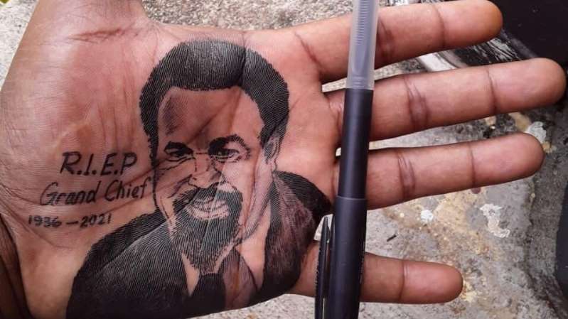 In the lead-up to the funeral, lifelike portraits of a smiling Sir Michael Somare were drawn on the palms of hands and shaved into the back of one man’s head, as part of artistic tributes toward the founding father.