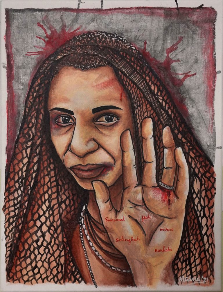 The works are part of an online exhibition called “Sa Pu Kisah: Buka Mata, Buka Hati” or “My Stories: Open Your Eyes, Open Your Hearts”. The event was part of a digital campaign focusing on stories of Papuan women. The exhibition was initiated by a visual art group in Papua, Udeido, and Asia Justice and Rights (AJAR).