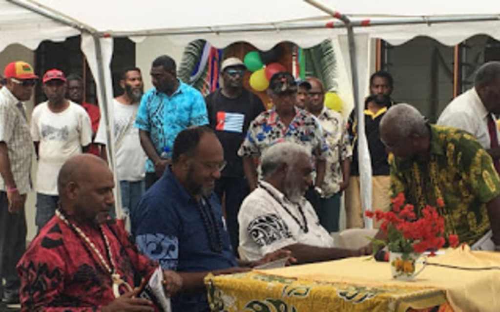 (from left:) United Liberation Movement for West Papua chairman Benny Wenda, Vanuatu prime minister Charlot Salwai and deputy prime minister Joe Natuman, as well as ULMWP deputy chairman Octo Mote at the Movement’s summit in Port Vila, 1 December 2017. Photo: Australia West Papua Association